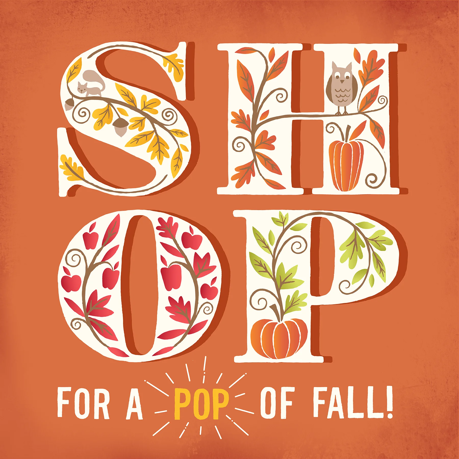 Illustrated typography created for Stamp Idea Group, to be used in the Fall advertising campaign for a cooperative of regional malls in the Southeast. The lettering was used in a broad range of marketing materials, including Facebook and Twitter landing pages, email marketing, print advertising and in-store signage.